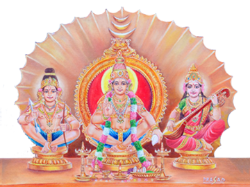 Sastha at the centre with “Sangu(the shells of sea-creature, seen in all rituals)” in his left hand and the symbol “Varada” in the right , Prabha his wife with “Veena (a stringed musical instrument)” in her hands on his (Sastha) and Sathyakan , his son on the right side with bow and arrows on the same “Peedha(a small platform)”.